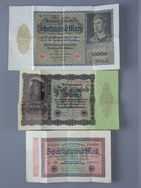THREE GERMAN BANK NOTES for ten thousand marks (1922), fifty thousand marks (1922) and twenty thousand marks (1923)