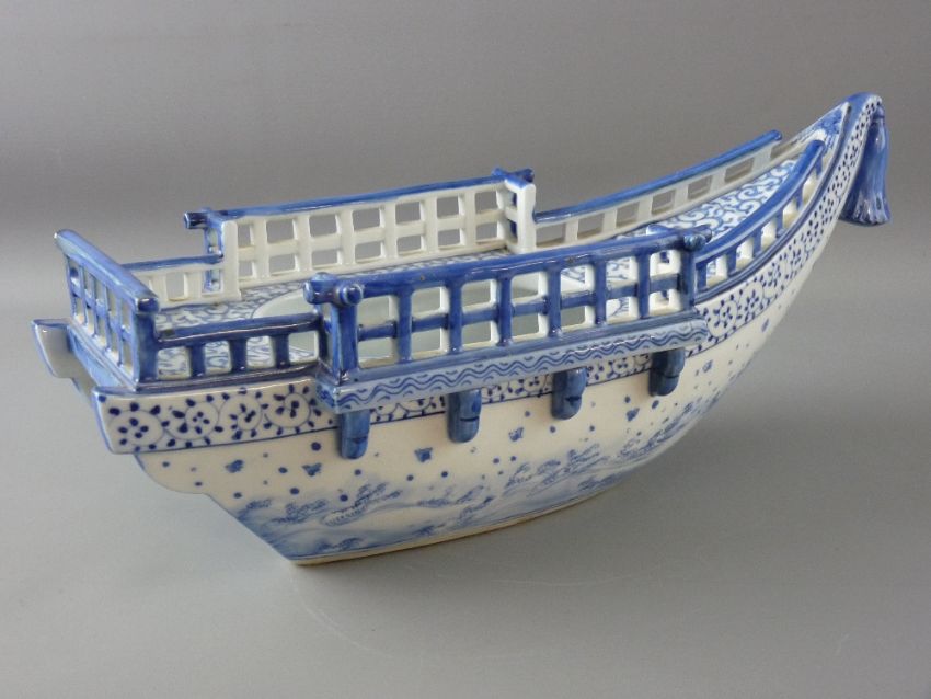 A CHINESE PORCELAIN BOAT, blue and white decorated with swirling waves and birds to the keel, tasselled bow and pierced gallery deck with swirling vine decoration, central oval aperture, carp decorated to the interior, 15.5 cms high maximum, 39.5 cms long