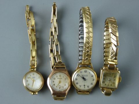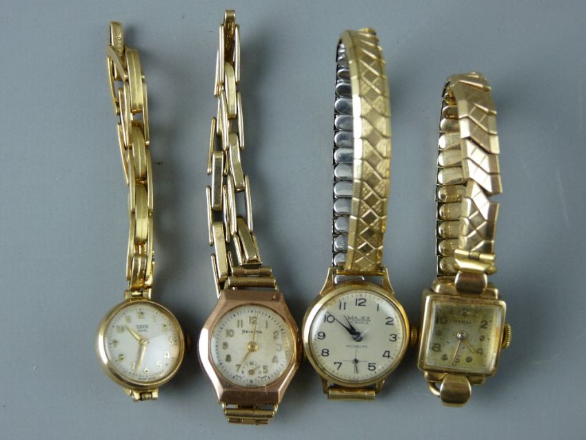 FOUR NINE CARAT GOLD ENCASED LADY'S WATCHES - a square dial Damas, a circular dial Tudor Royal, a Helvetia and a Magex, all with expanding bracelets