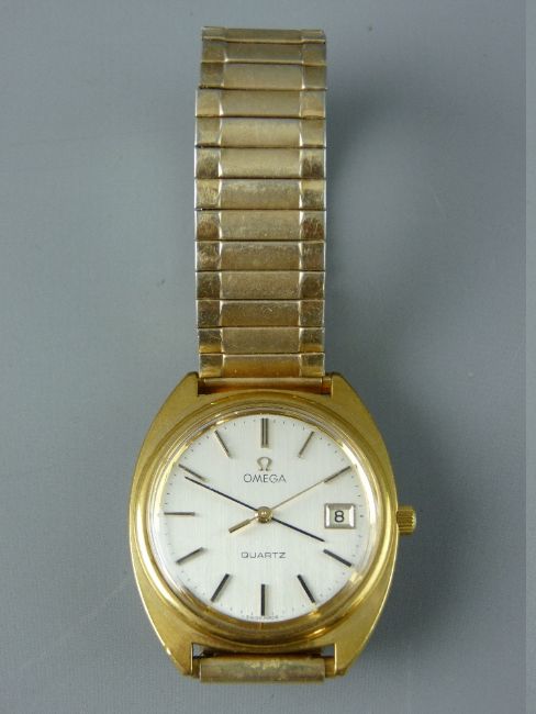 A GENT'S OMEGA YELLOW METAL & STAINLESS STEEL CASED QUARTZ CALENDAR WRISTWATCH with expanding Omega bracelet
