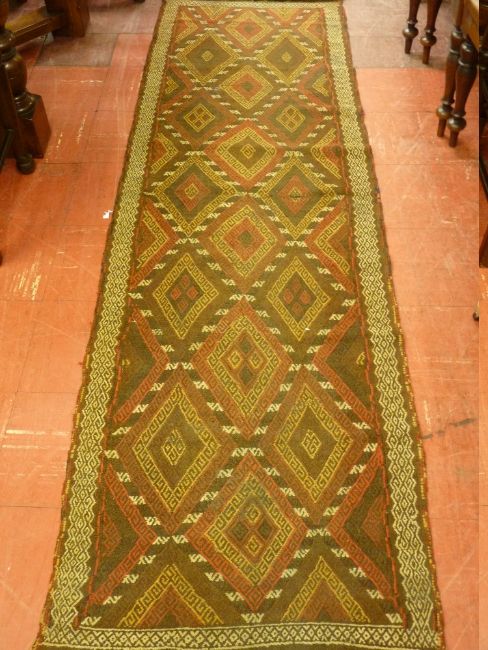 A SUZNI KILIM RUNNER, rust and red ground with repeating multi-diamond central pattern and narrow border, 234 x 68 cms