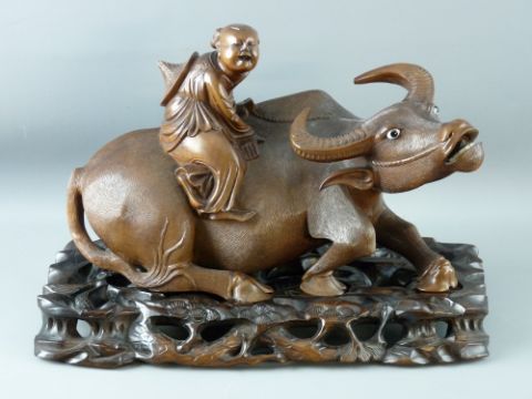 A CHINESE HARDWOOD CARVING on stand in the form of a recumbent water buffalo with a child upon its back, the stand in a pierced foliate design, 24 cms high overall, 37 cms wide