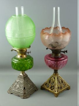 TWO VICTORIAN OIL LAMPS with iron bases, coloured glass reservoirs and fine etched glass shades