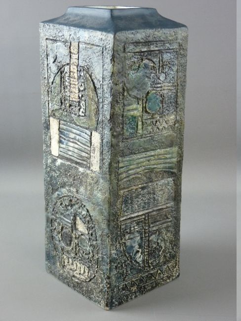 A LARGE TROIKA POTTERY CHIMNEY VASE, square form with raised and incised abstract designs, 31.5 cms high, marked to the base Troika, Cornwall, England and monogram for Linda Taylor (with restorations)