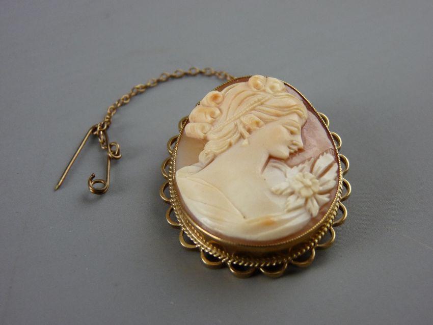 A NINE CARAT GOLD FRAMED OVAL LADY CAMEO BROOCH with safety chain