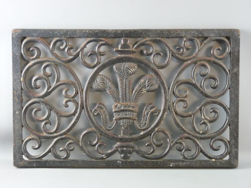 A PIERCED CAST IRON PANEL with 'Ich Dien' and Prince of Wales feathers central motif and surrounding scroll work pattern, T F Foundry mark verso, 37 x 60.5 cms