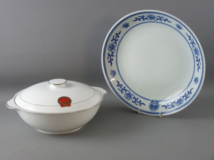 A CHINESE PORCELAIN BLUE & WHITE CHARGER and a white lidded tureen, 20th Century bearing the national emblem of the People's Republic of China, modern underglazed seal marks to both, 33.5 and 26.5 cms diameters respectively