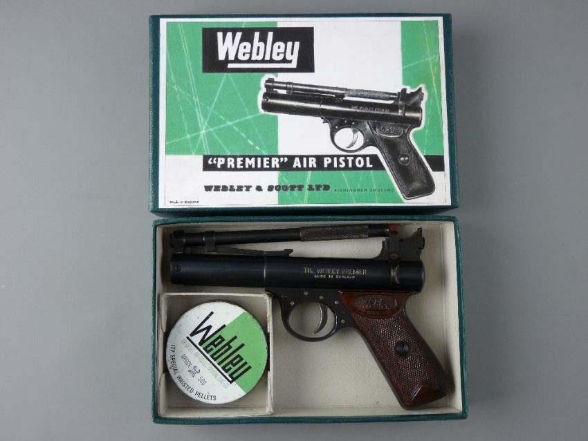 AIR PISTOL .22 Webley Premier, early E series, 69/72, batch 823, original white letters, in later correct style box with accessories, near new, good pressure, 17 cms barrel