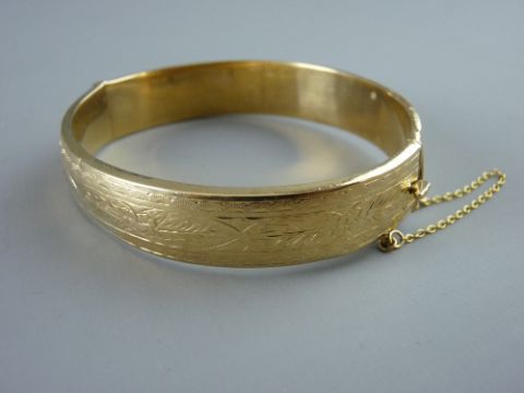 A NINE CARAT GOLD HALF BRIGHT CUT HOLLOW BANGLE, 21.5 grms gross