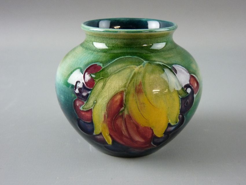 A MOORCROFT 'LEAF & BERRY' SQUAT VASE decorated on a tonal green ground, impressed Moorcroft to the base, 7.25 cms high (crazing)