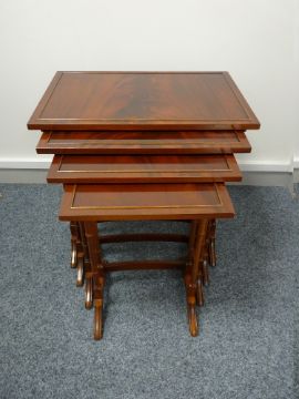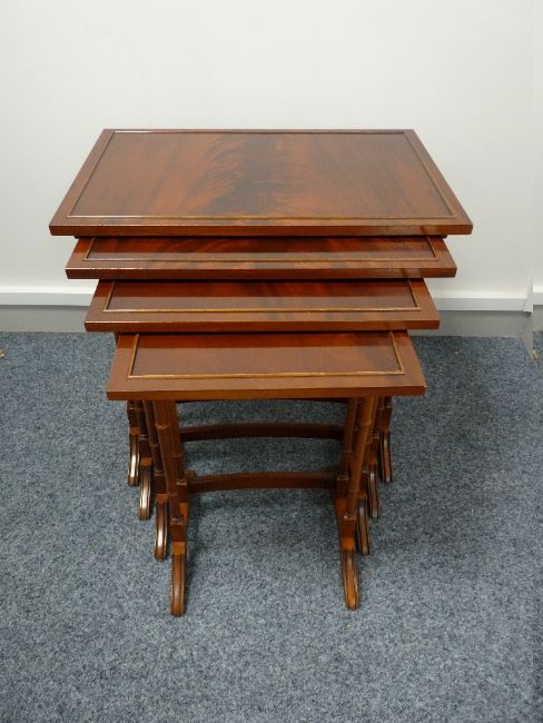 A REPRODUCTION SET OF FOUR MAHOGANY SIDE TABLES, 59.5 cms high, 58.5 cms wide, 39 cms deep the largest