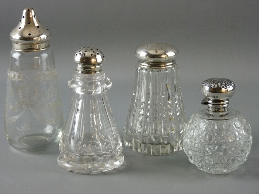 A HOBNAIL CUT GLASS SCENT BOTTLE WITH HINGED SILVER LID & COLLAR and three attractive glass sifters (one etched), all with silver tops