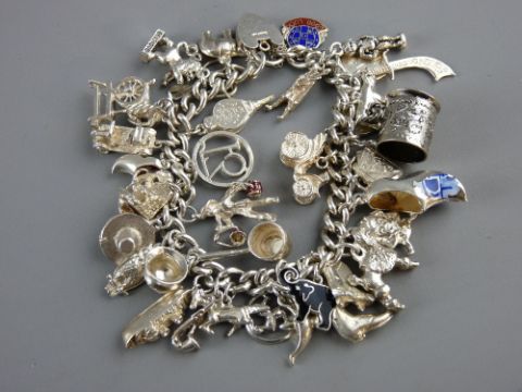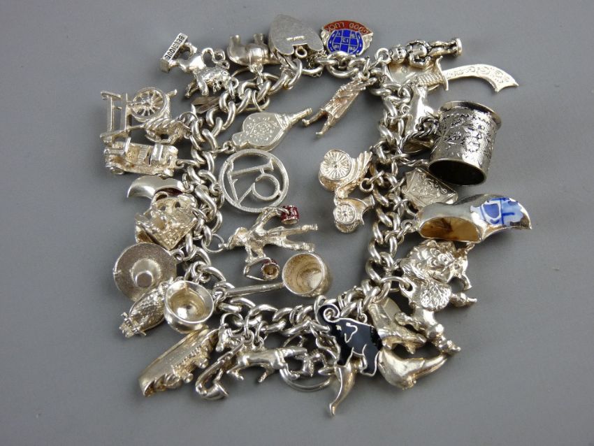 A SILVER CHARM BRACELET WITH THIRTY EIGHT CHARMS ATTACHED, some enamelled, 2.8 troy ozs gross