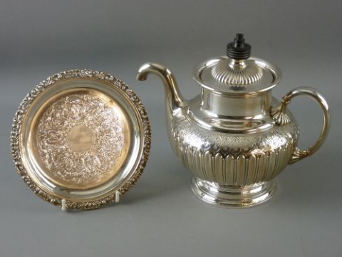 A FINE BRIGHT CUT ELECTROPLATED INFUSER TEAPOT by James Dixon & Sons - 'Royals Patent Self Pourer' with a small circular appropriate tray