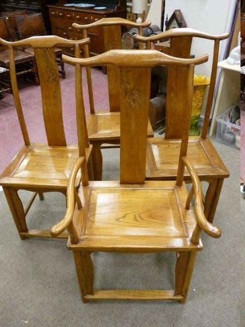 A SET OF FOUR (THREE PLUS ONE) LIGHT COLOUR HARDWOOD CHINESE CHAIRS, dragon motif to the central splats