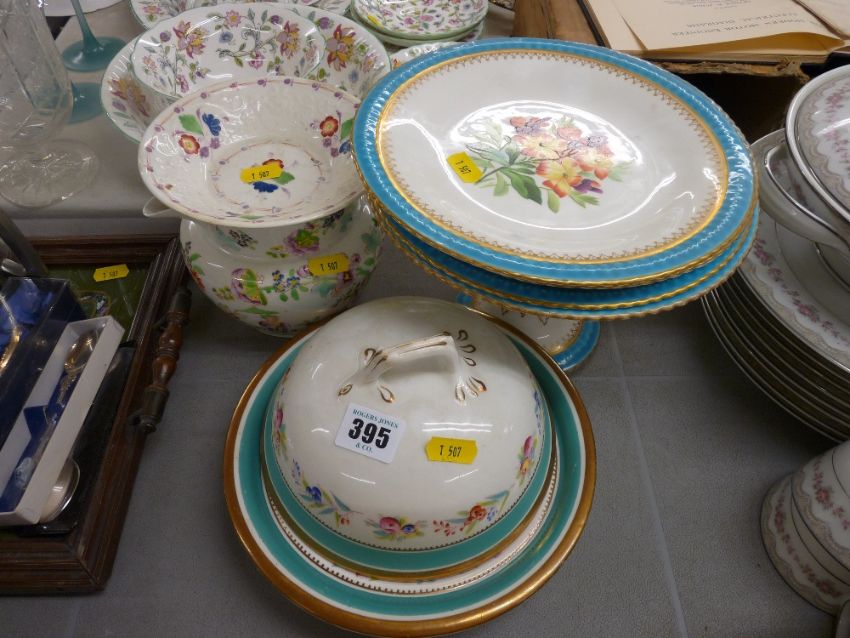 Three floral decorated Staffs plates and matching comport, Gaudy Welsh bowl and similar china items