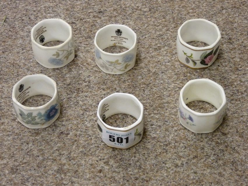 Six Wedgwood bone china floral decorated napkin rings
