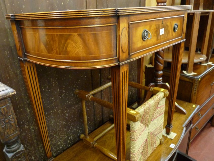 Reproduction mahogany single drawer hall table on reeded supports and a string topped oak footstool