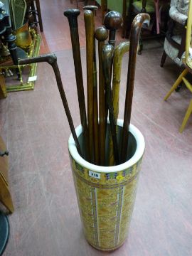 Collection of hardwood and other walking canes in a modern pottery stickstand