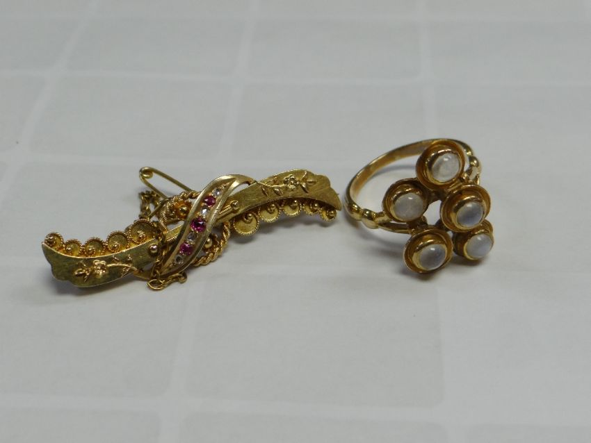 A five-stone moonstone ring & a seven-stone 15ct ruby set bar brooch