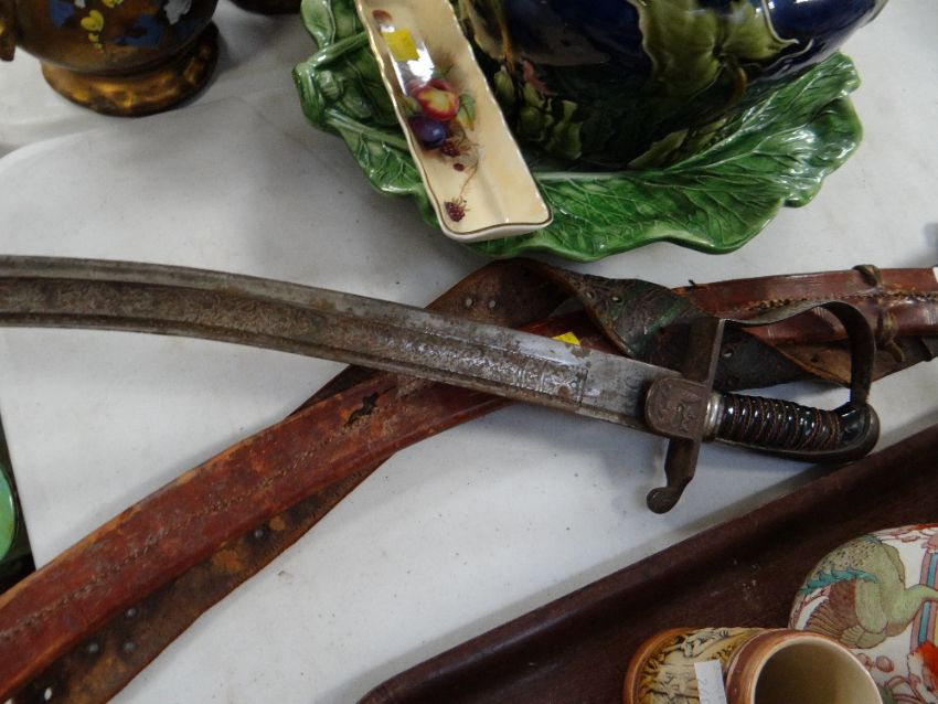A believed Turkish curved blade sword in leather scabbard Dimensions The blade and scabbard are approximately 80cms long, the blade is 3cms broadCondition there is no jiggle in the pommel, but a few of the grip wires are a bit loose, some are good