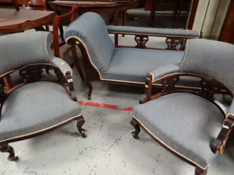 A three-piece Edwardian drawing room suite comprising chaise longue & two tub-style chairs (for re upholstery)