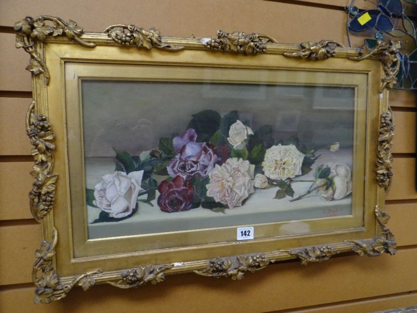 Framed oil on canvas - still life of cut roses by L DEAKIN, signed & dated 1902