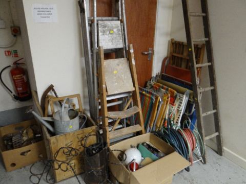 The garage contents from a Swansea house clearance including retro deck chairs & boxes of general sundries, two rolls of hose etc