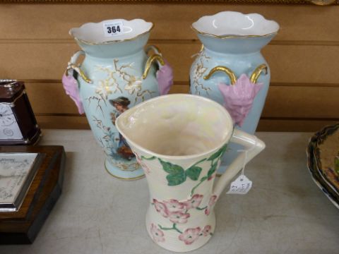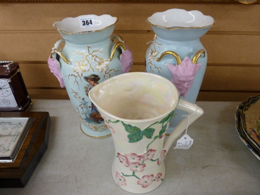 Pair of twin handled Staffs vases and a Maling lustre jug