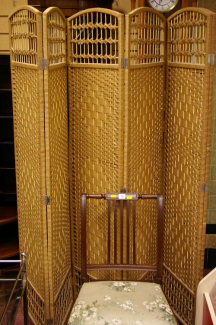 Six panel wicker folding dressing screen with an antique mahogany Regency style side chair