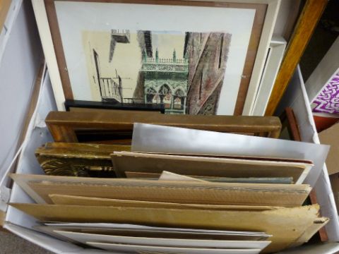 Box of framed and unframed pictures and prints
