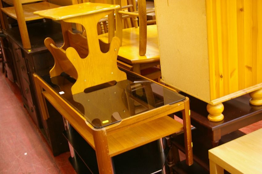 Three tier chrome and black glass entertainment stand, mid Century teak glass topped coffee table and a modern magazine side table