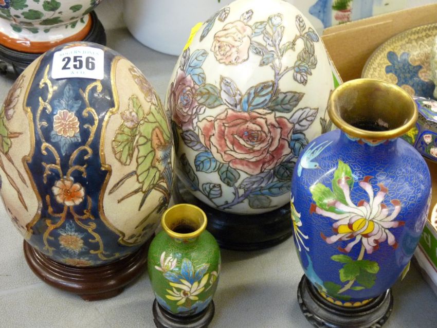 Two decorative porcelain eggs on stands and two cloisonne vases on hardwood stands