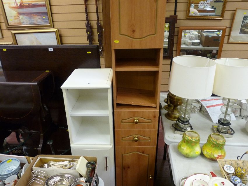 Light wood effect modern narrow cupboard with central drawers and a similar shaped white bathroom cupboard
