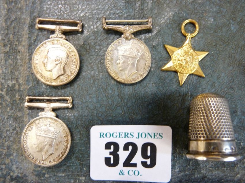 Set of four Second World War dress medals and a silver thimble