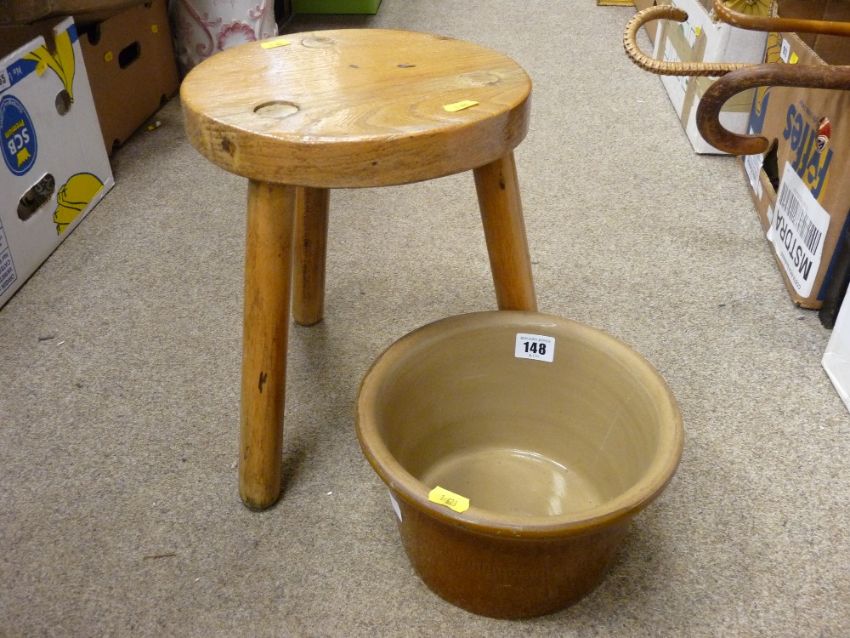 Three legged milking stool, an egg crock