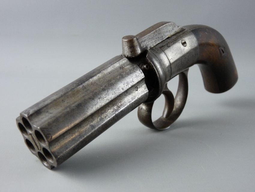 A SIX SHOT SELF COCKING PERCUSSION PEPPER BOX REVOLVER, 7 cms barrel, total length 20 cms with polished walnut curved grip and foliate decoration