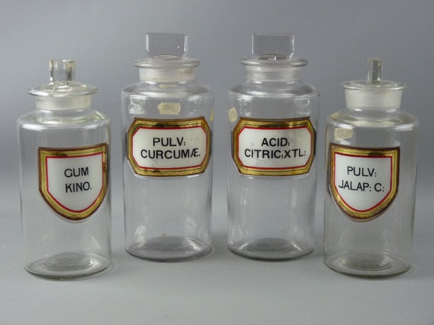 FOUR LARGE CHEMIST'S PLAIN GLASS JARS with well preserved Latin labels and all with stoppers