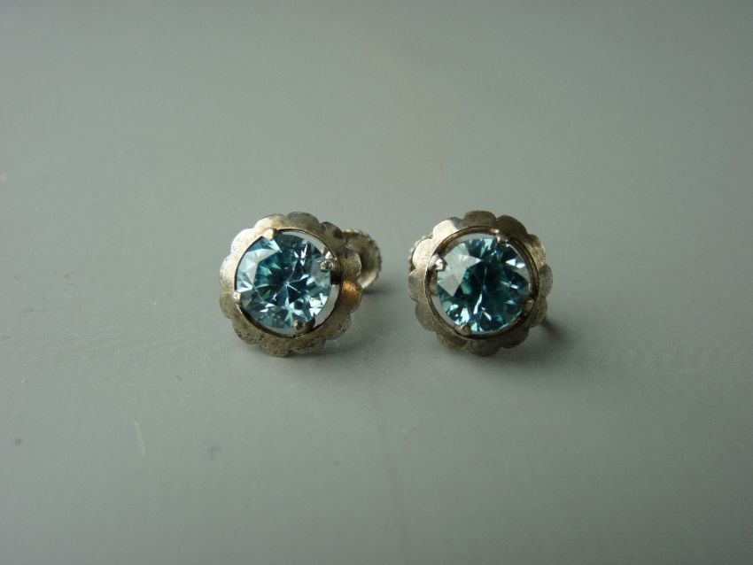 A PAIR OF STERLING SILVER BLUE ZIRCON STUD EARRINGS, the round faceted stones of approximately 7 x 7 mm, visual estimate 4.3 carats, 3.5 grms gross