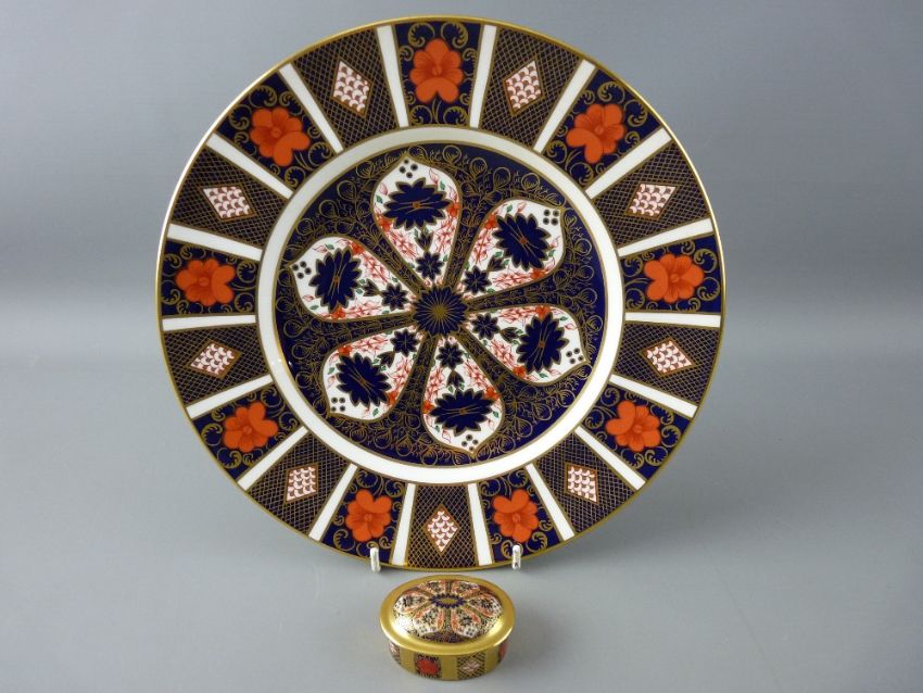 ROYAL CROWN DERBY IMARI '1128' PATTERN, 10.5 ins plate and a lidded pill box, first quality factory backstamps to the bases