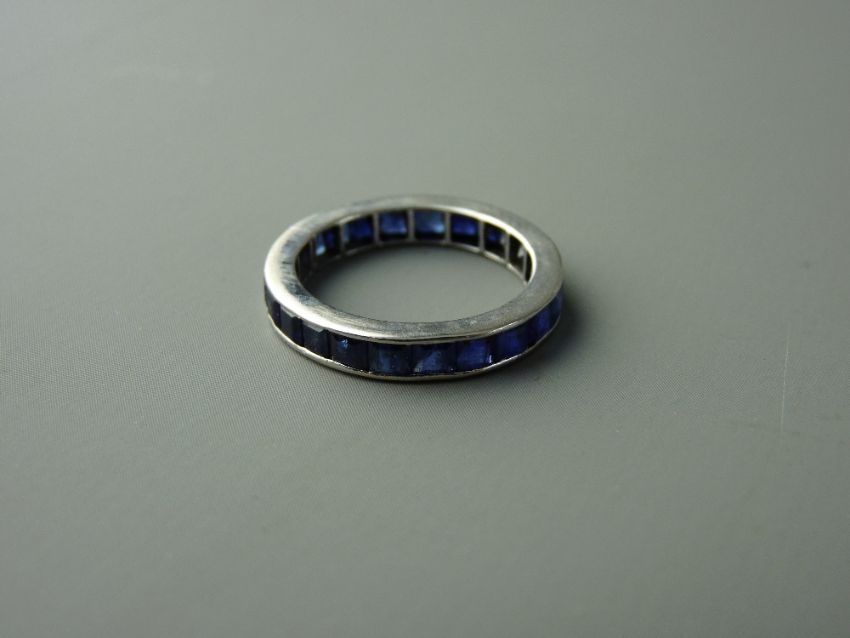 AN EIGHTEEN CARAT WHITE GOLD FULL ETERNITY SAPPHIRE RING having approximately twenty five square faceted dark blue sapphires, estimated 3 carats, 2.8 grms total
