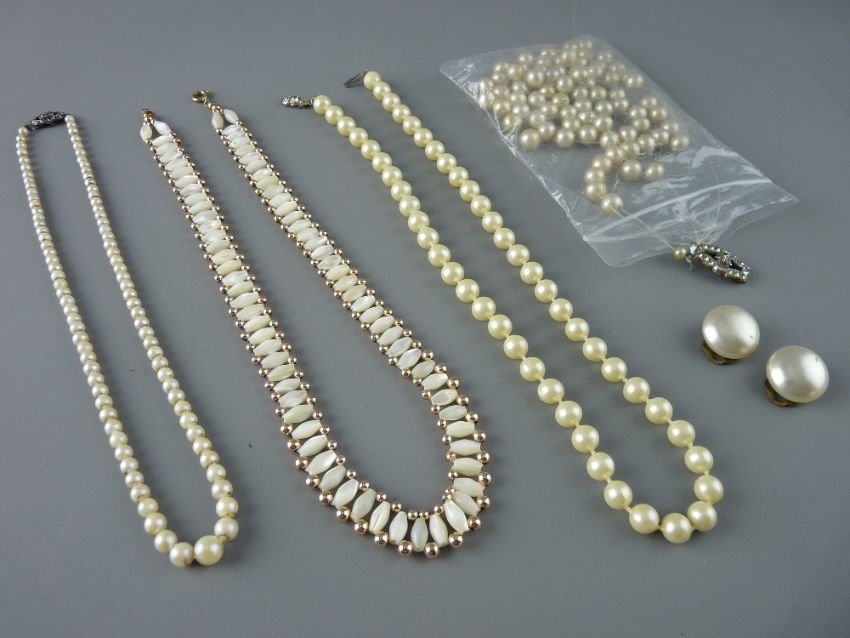 A SINGLE STRAND NECKLACE OF CULTURED PEARLS with silver and marcasite clasp, a mother of pearl bead necklace with gilt metal separators and a quantity of simulated pearls