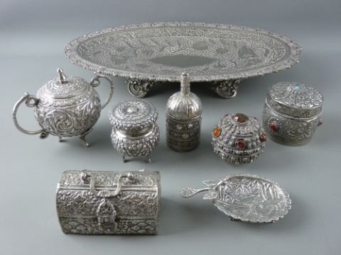 EASTERN UNTESTED WHITE METAL TABLE & ORNAMENTAL WARE (a quantity) to include a 42 cms pierced and embossed four footed oval dish, a pin dish with crane decoration and Chinese pheasant handle on four feet, a cylindrical powder vessel, a lidded casket, a twin handled lidded globular along with three further lidded containers, one with semi-polished amber colour settings, various measurements, no visible markings