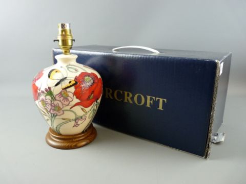 A MOORCROFT 'FAMILY THROUGH FLOWERS' TABLE LAMP, decorated on an ivory ground, set on a wooden base, 26.5 cms high overall