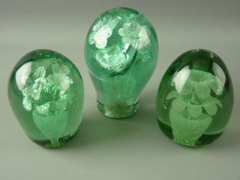 THREE VICTORIAN GREEN GLASS DUMP PAPERWEIGHTS with double flower head in pot inclusions, 10 cms high the tallest (scuffs and marks, all with rough pontils)