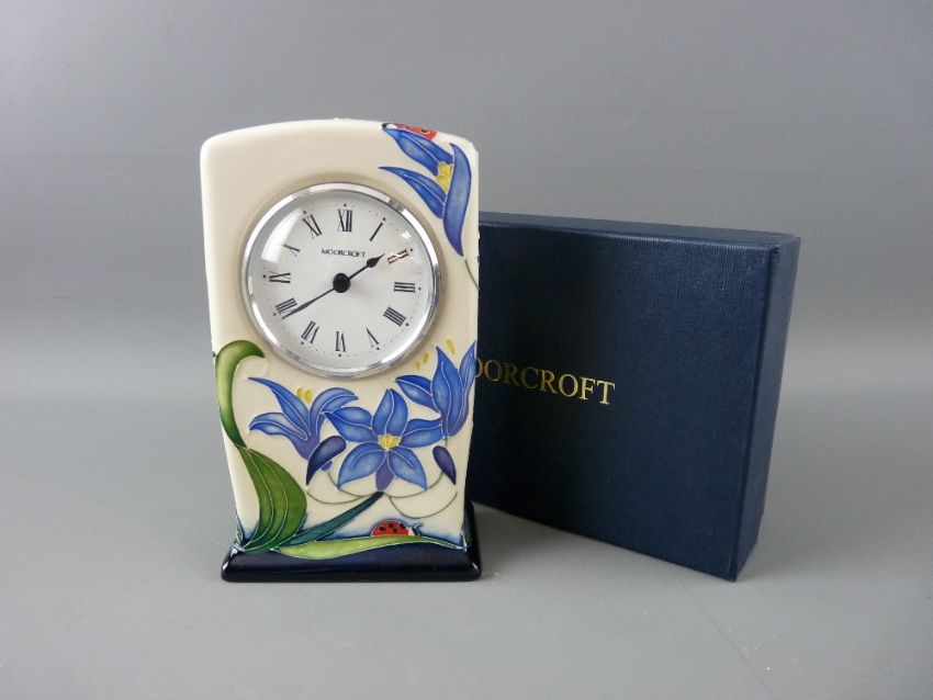 A MOORCROFT 'FLY AWAY HOME' MANTEL CLOCK, designed by Rachel Bishop, decorated on a cream ground, impressed 'Moorcroft' with designer monogram and dated 2005, 16 cms high, (boxed)