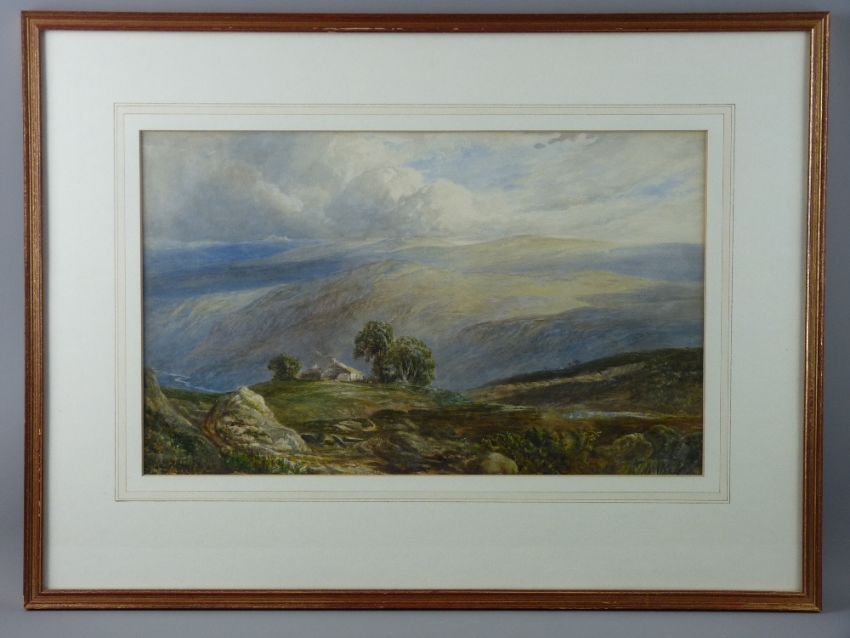 EARLY 20th CENTURY ENGLISH watercolour - Dales landscape with hilltop farmstead by trees, 28 x 46 cms