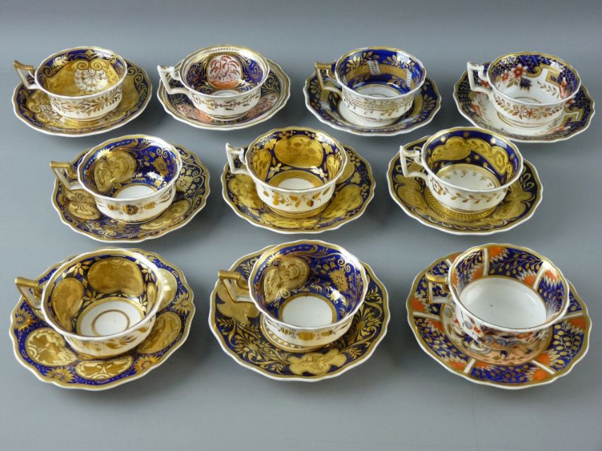 TEN PROBABLY RIDGWAYS CABINET CUPS & SAUCERS, early 19th Century in various gilt cobalt and Imari palettes, Old English shape with painted pattern numbers to the base including 2/1109, 2/1301, 2/1298 etc (two cups and saucers with non-matching patterns, others with some gilt rubbing)