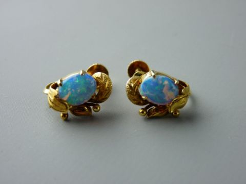 A PAIR OF FOURTEEN CARAT GOLD OPAL SET STUD EARRINGS, each having an oval cabochon opal, 8.7 x 6.5 mm across approximately, total gross weight 5.6 grms