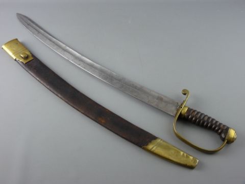 A LATE 19th CENTURY LANCASHIRE POLICE SHORT CURVED SWORD having a twist leather handle and brass and leather scabbard, 58 cms long